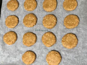En una bandeja de horno colocamos una lámina de papel vegetal y vamos colocando las galletas encima.